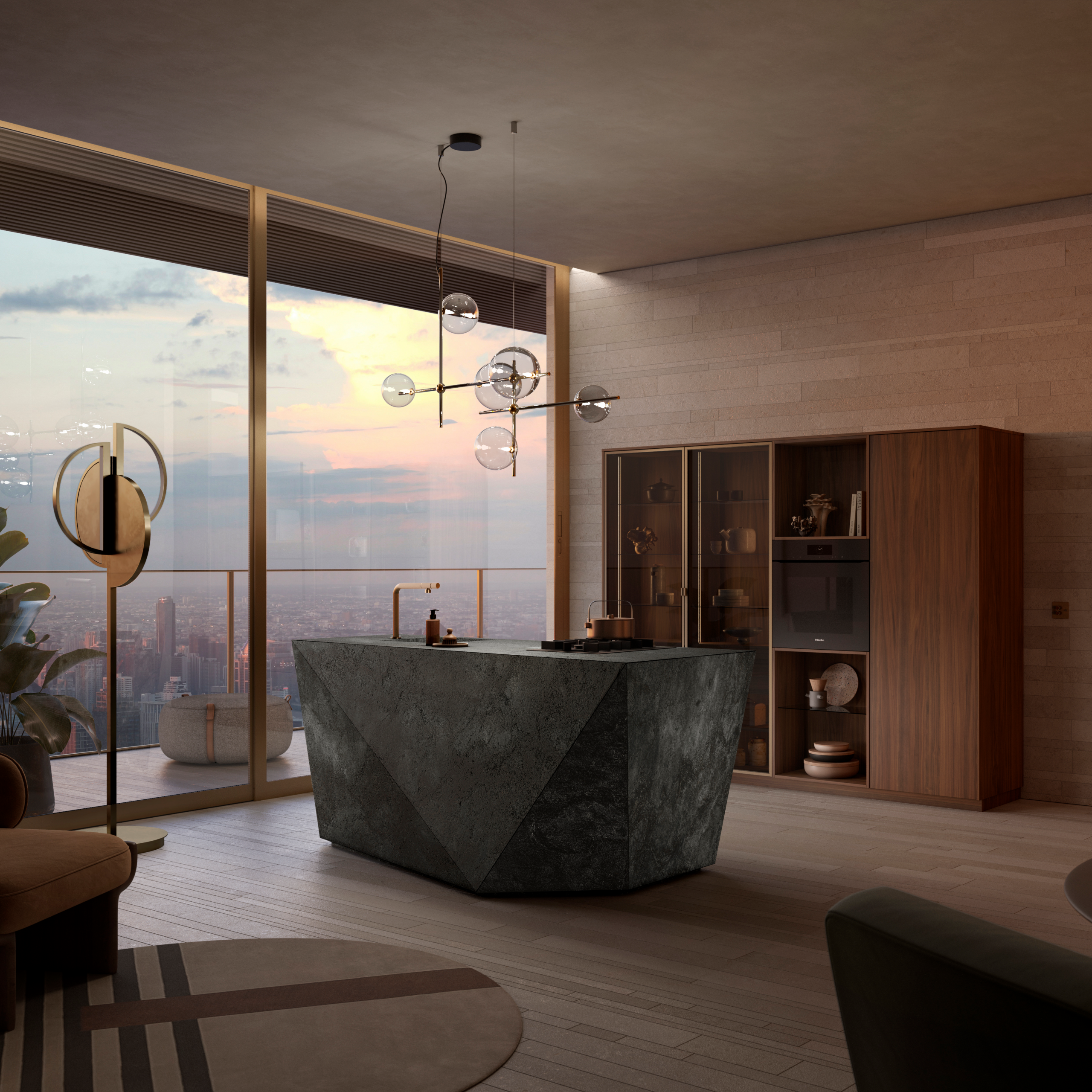 Natürliche Materialien, stimmige Beleuchtung und fein abgestimmte Farben schaffen einen Raum, der Offenheit und Ruhe zugleich vermittelt. Eine Küche, in der Alltag und Genuss selbstverständlich zusammenfinden.
